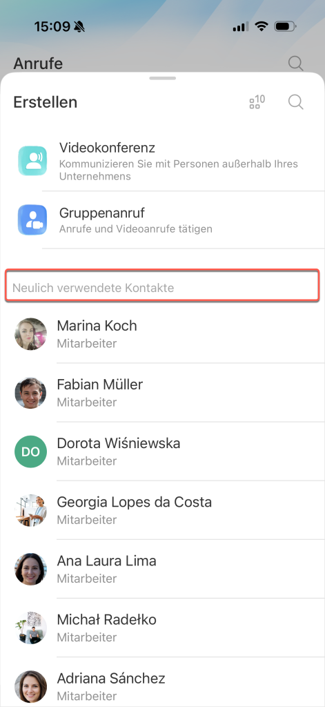 Wenn Sie kürzlich mit einem Kollegen im Chat oder Anruf kommuniziert haben, erscheint diese Person in der Liste Neulich verwendete Kontakte. Tippen Sie auf den Namen des Mitarbeiters, um ihn direkt anzurufen.