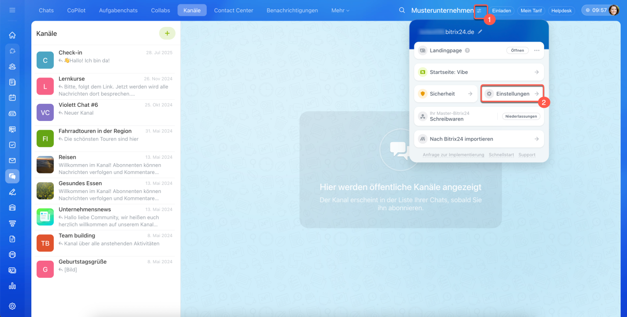 1–2. Klicken Sie auf die Einstellungen neben dem Namen Ihres Bitrix24 und gehen Sie auf Einstellungen (⚙️) im Widget.