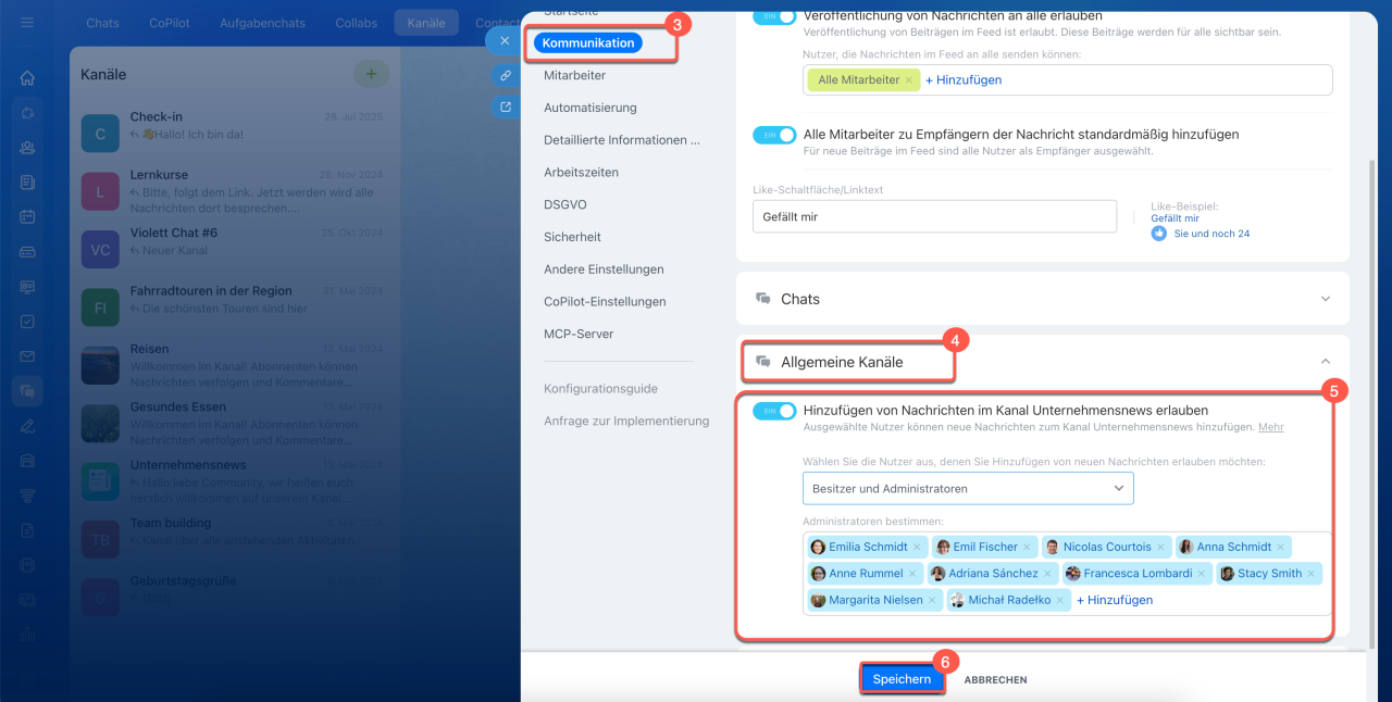 3–5. Klicken Sie auf Kommunikation > Allgemeine Kanäle und wählen Sie aus, wer Beiträge im Kanal hinzufügen darf.