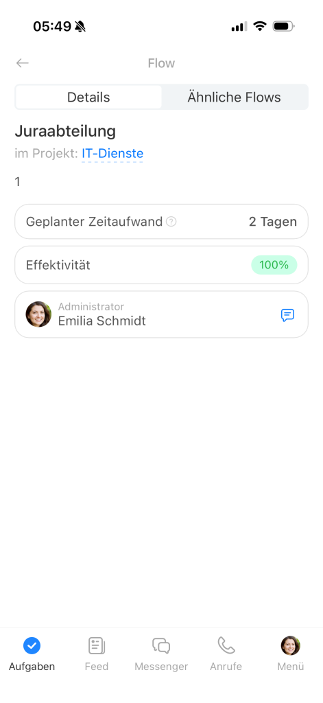 In den mobilen Flows werden auch allgemeine Informationen angegeben: Name, Beschreibung, Projekt, durchschnittliche Zeit, Effektivität und Administrator. Im Tab Ähnliche Flows finden Sie die Flows, die von demselben Mitarbeiter erstellt wurden.