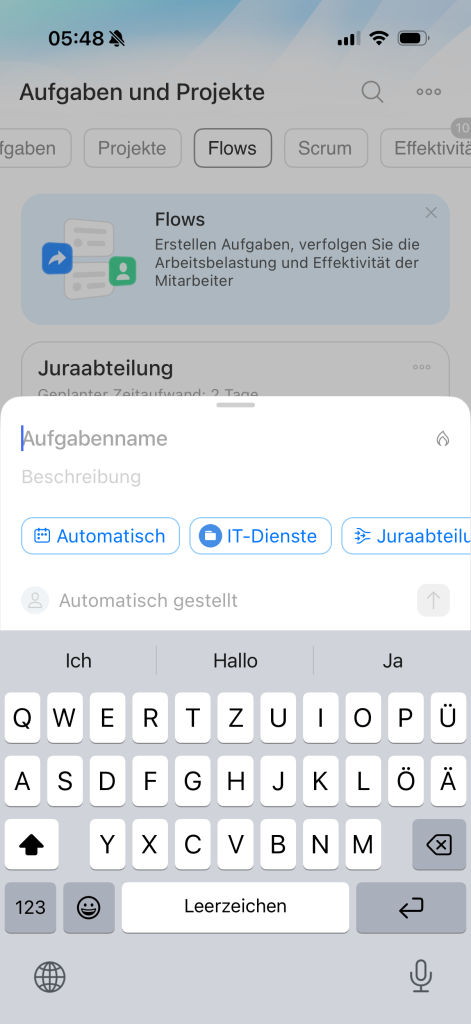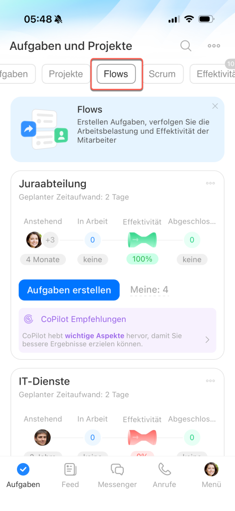 In der mobilen Anwendung sind die Flows auch verfügbar. Sie befinden sich im Bereich Aufgaben > Flows. Hier können Sie Aufgaben erstellen und verfolgen.