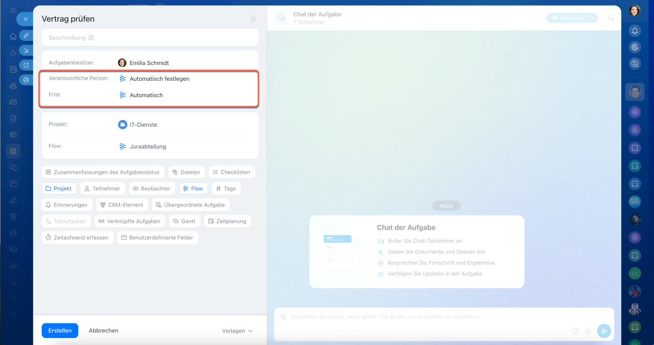 Aufgaben manuell zuweisen. In diesem Fall gibt der Übergeordnete die zuständige Person für die Aufgabenverteilung an. Dieser Mitarbeiter wird automatisch als verantwortliche Person in den neuen Aufgaben ausgewählt und kann danach den Verantwortlichen ändern.