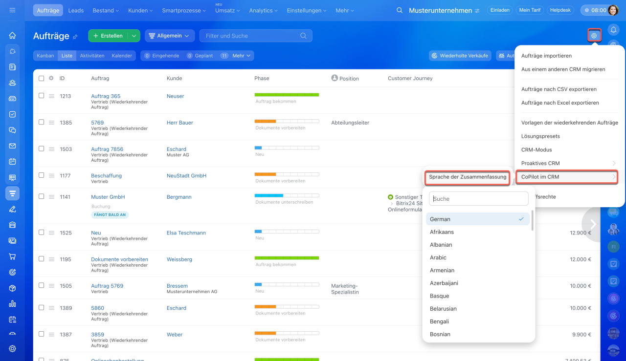 Öffnen Sie den Bereich Leads oder Aufträge und gehen Sie auf Einstellungen (⚙️) > CoPilot > Sprache der Zusammenfassung auswählen.