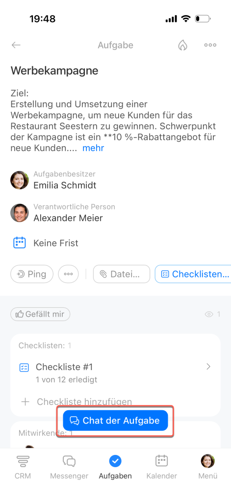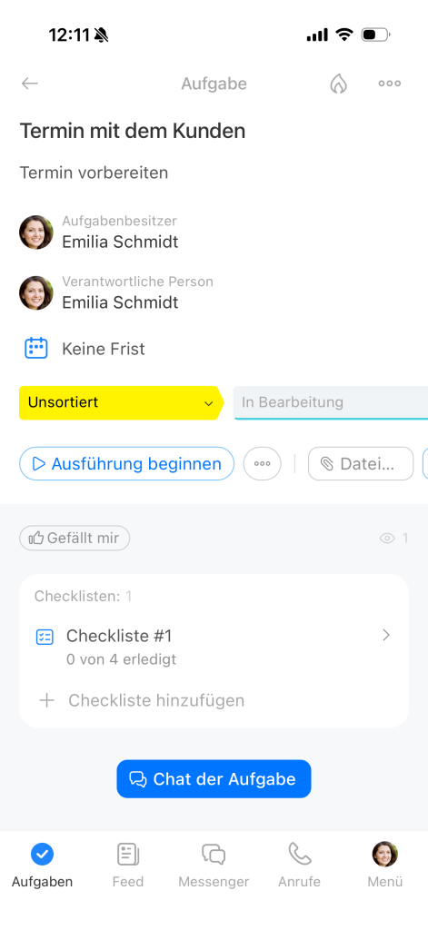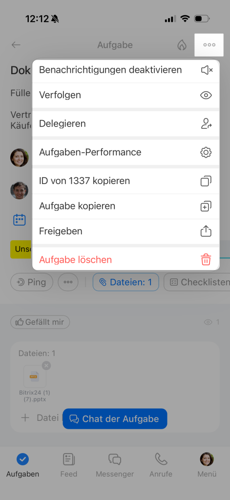 Der Aufgabenchat in Bitrix24 dient der Kommunikation und Koordination innerhalb einer Aufgabe – z. B. um Details zu besprechen, Fristen oder Status zu ändern und den Fortschritt zu sehen. Im Chat können Sie Nachrichten austauschen, Dateien teilen und Kollegen anrufen. Um den Chat zu öffnen, tippen Sie auf den Button Chat der Aufgabe.
