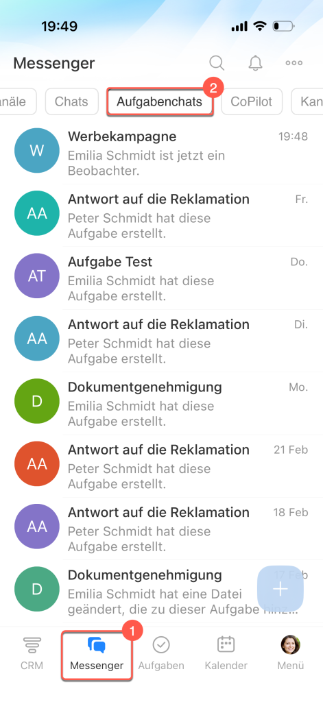 Um die Liste aller Aufgabenchats zu öffnen, tippen Sie auf Messenger > Aufgabenchats. Hier werden alle Diskussionen zu Aufgaben angezeigt, an denen Sie beteiligt sind.