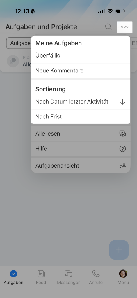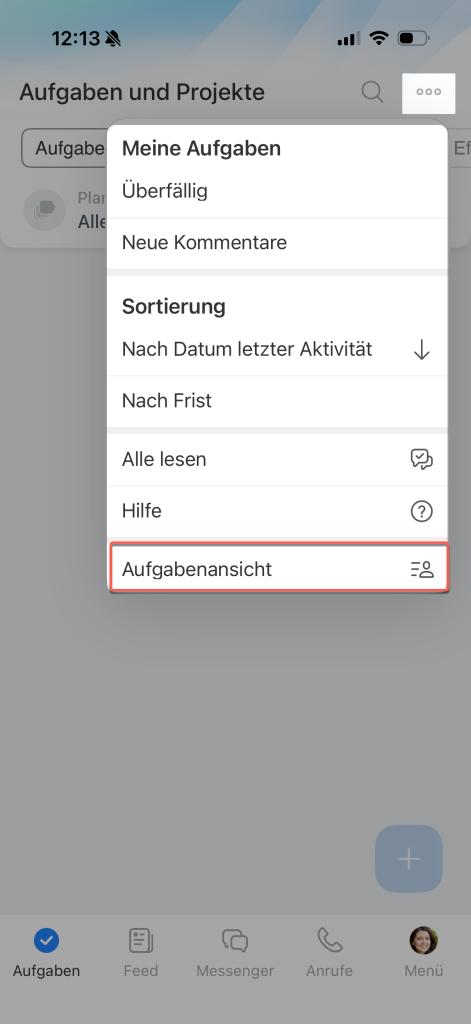 Um die Ansicht zu ändern, klicken Sie auf Drei Punkte (...) > Aufgabenansicht.