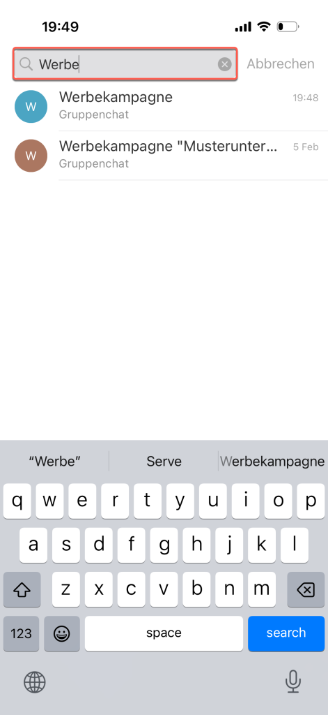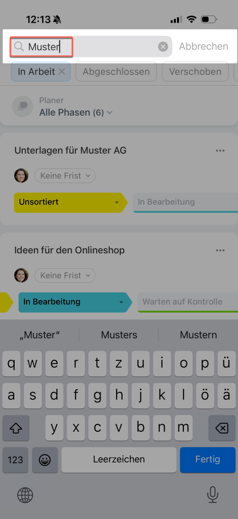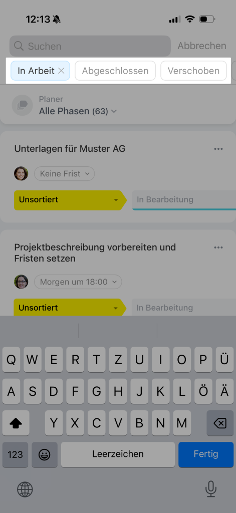Um schnell den Chat einer bestimmten Aufgabe zu finden und weiterzuarbeiten, nutzen Sie die Suche. Tippen Sie in der Liste der Aufgabenchats auf das Lupensymbol.