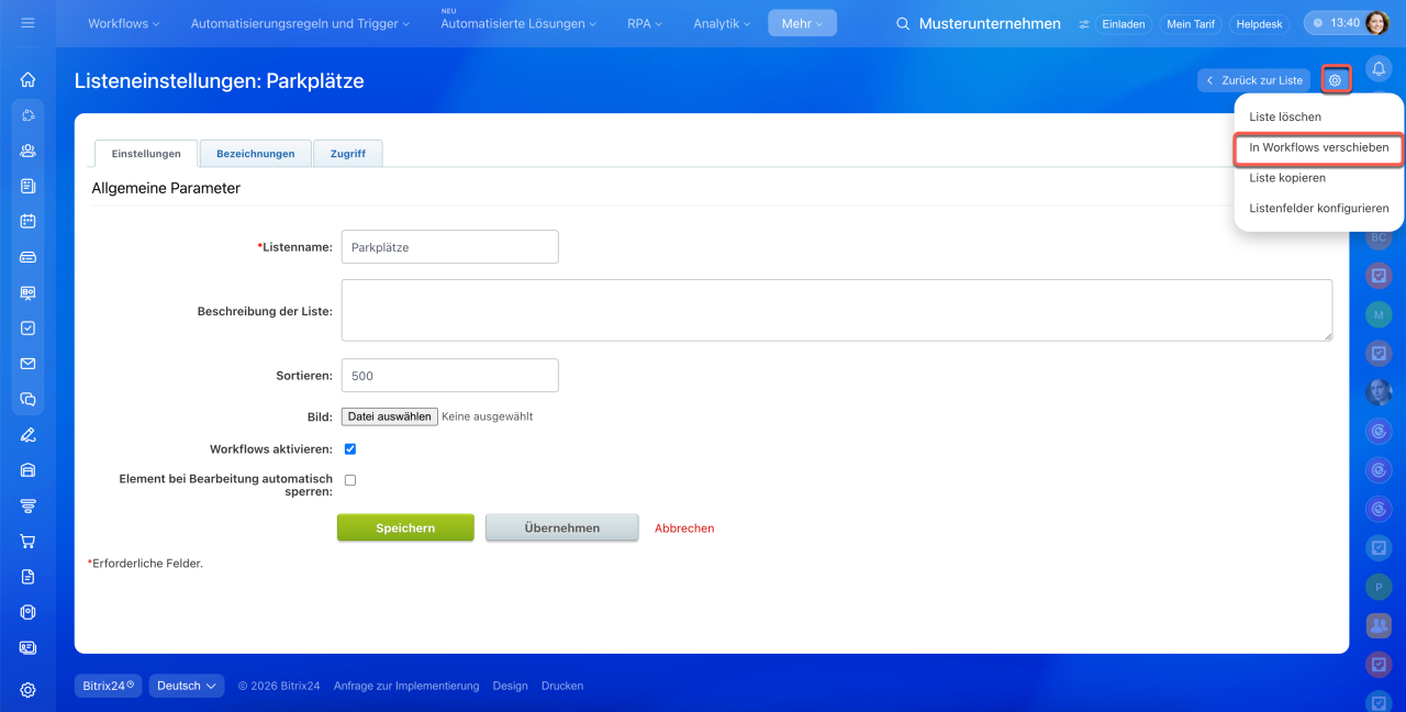 - Um mit der Liste direkt aus dem Feed zu arbeiten, öffnen Sie die Listeneinstellungen und wählen Sie den Punkt In Workflows verschieben aus.