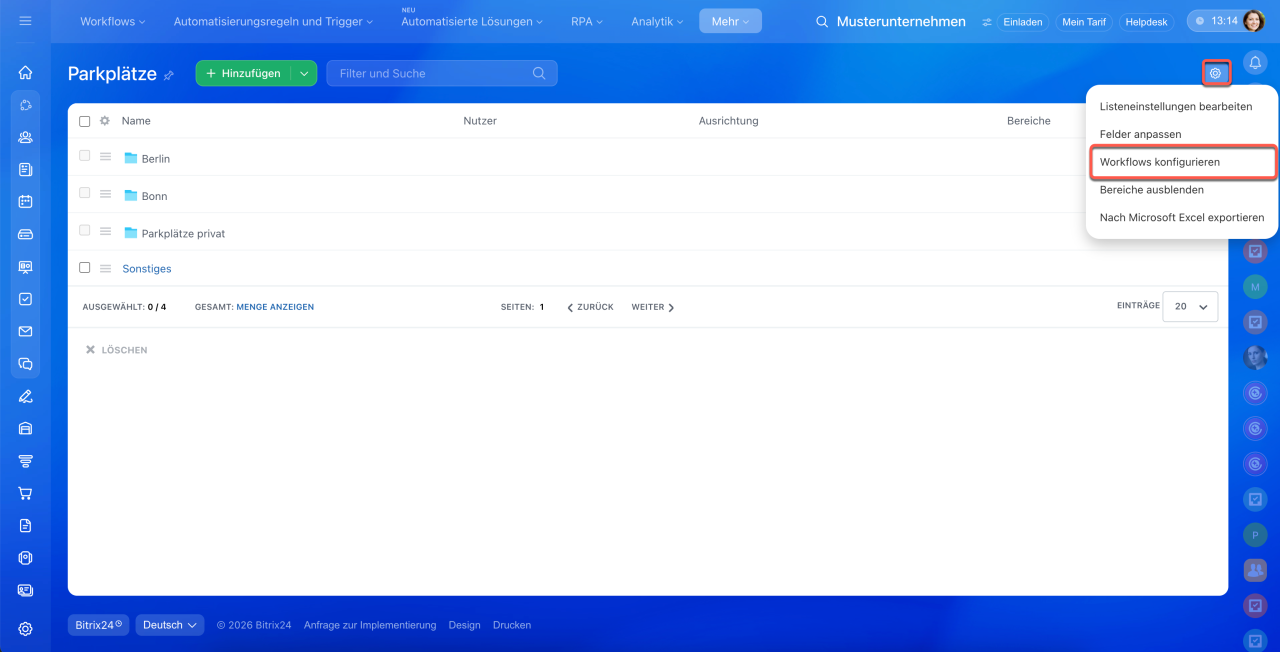 Weiter können Sie mit Workflows über den Punkt Workflows konfigurieren arbeiten.