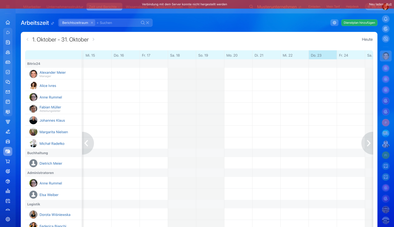Situation. Auf verschiedenen Bitrix24-Seiten sieht der Nutzer die Mitteilung "Keine Verbindung zum Server".