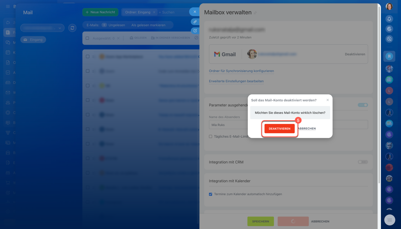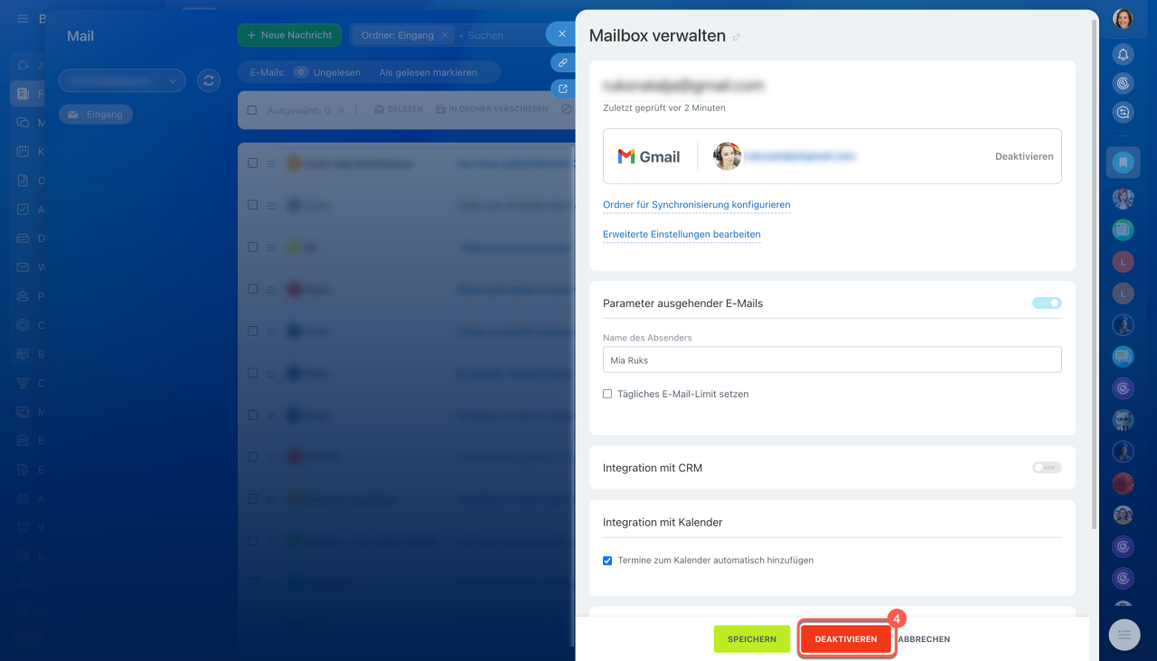 Wenn Sie die maximal erlaubte Anzahl an Mailboxen verbunden haben und Ihren Account auf einen niedrigeren Tarif herabstufen möchten, deaktivieren Sie einige Mailboxen in Ihrem Bitrix24. Andernfalls werden die zuletzt verbundenen Mailboxen nach dem Downgrade automatisch deaktiviert.
