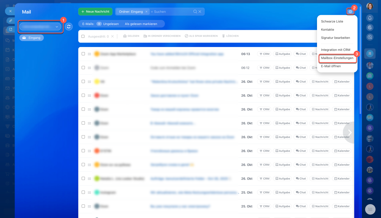 Bitrix24 hat ein Limit für die Anzahl der verbundenen Mailboxen pro Mitarbeiter. Die genaue Anzahl hängt vom gewählten Tarif ab. Im Tarif "Professional" können Sie beispielsweise bis zu 10 Mailboxen verbinden.