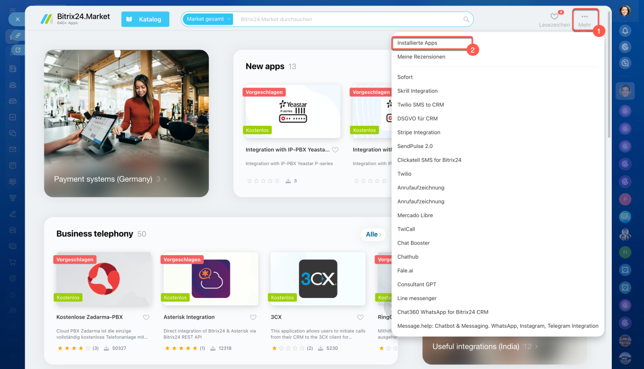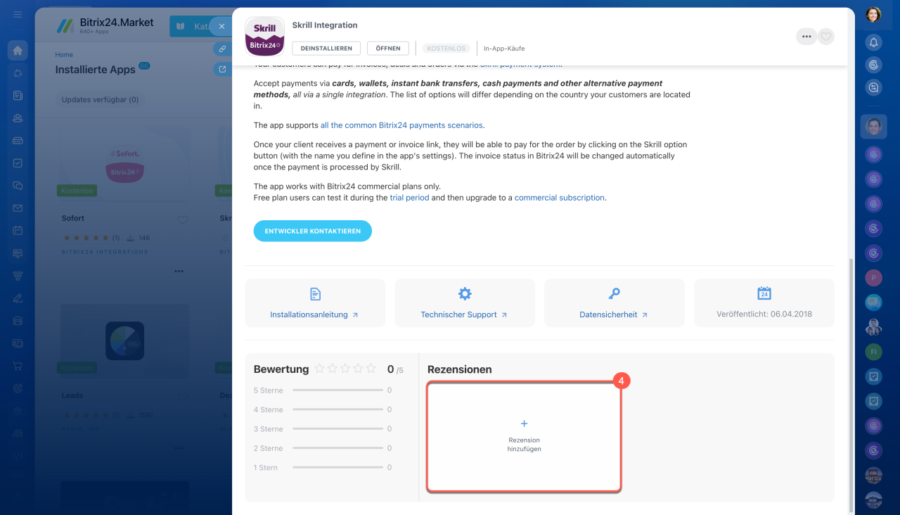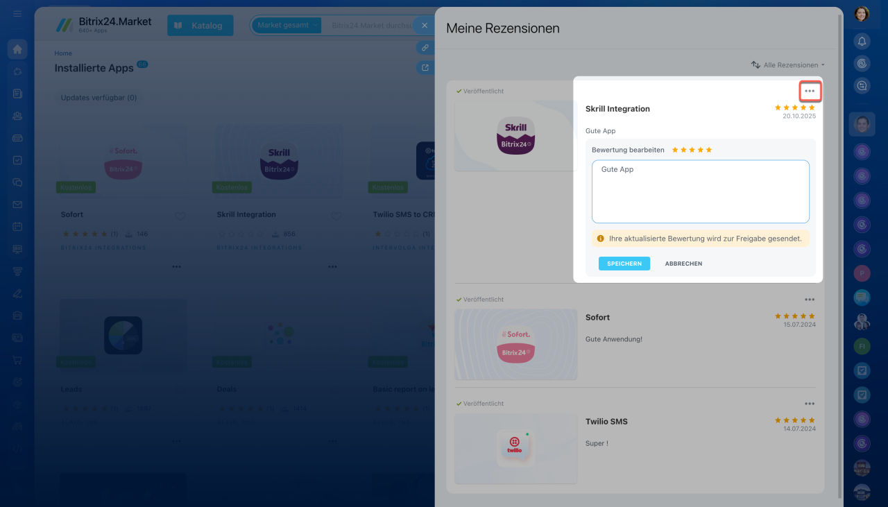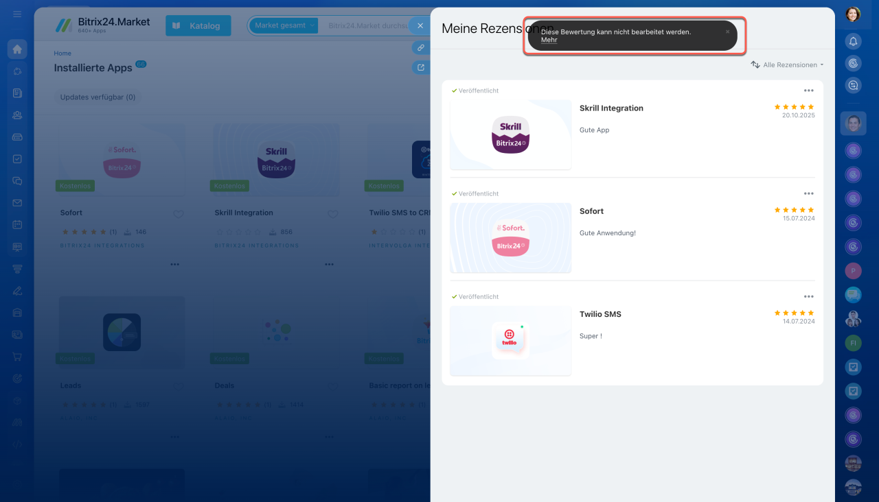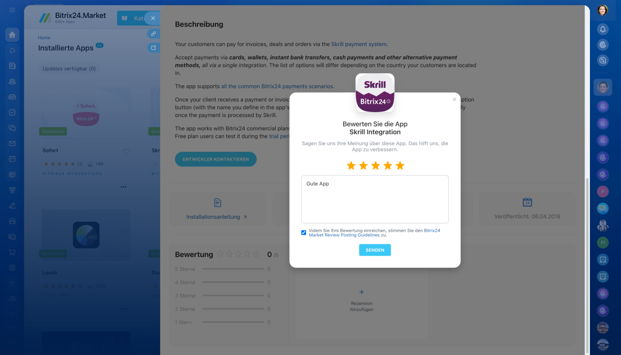 In Bitrix24 können Sie jede installierte App bewerten und eine Rezension hinzufügen. Die Rezensionen helfen anderen Nutzern, passende Apps auszuwählen, und den Entwicklern, wertvolles Feedback zur Weiterentwicklung der App zu erhalten.