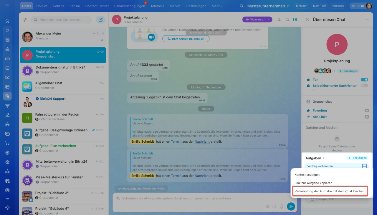 - die Verbindung der Aufgabe bzw. des Chats mit dem Chat oder Kanal zu entfernen.