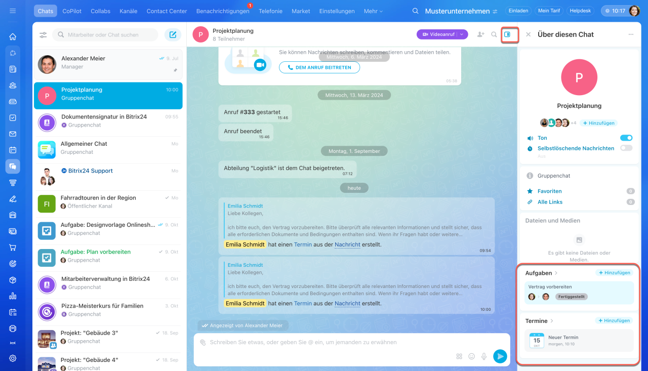 Um die Liste aller im Chat oder Kanal erstellten Termine oder Aufgaben anzuzeigen, öffnen Sie die Sidebar.