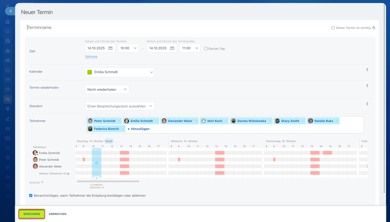 Die Terminbeschreibung enthält die Nachricht, aus der der Termin erstellt wurde, kann jedoch bei Bedarf bearbeitet oder gelöscht werden — die ursprüngliche Nachricht im Chat oder Kanal wird nicht geändert. Klicken Sie auf Speichern.