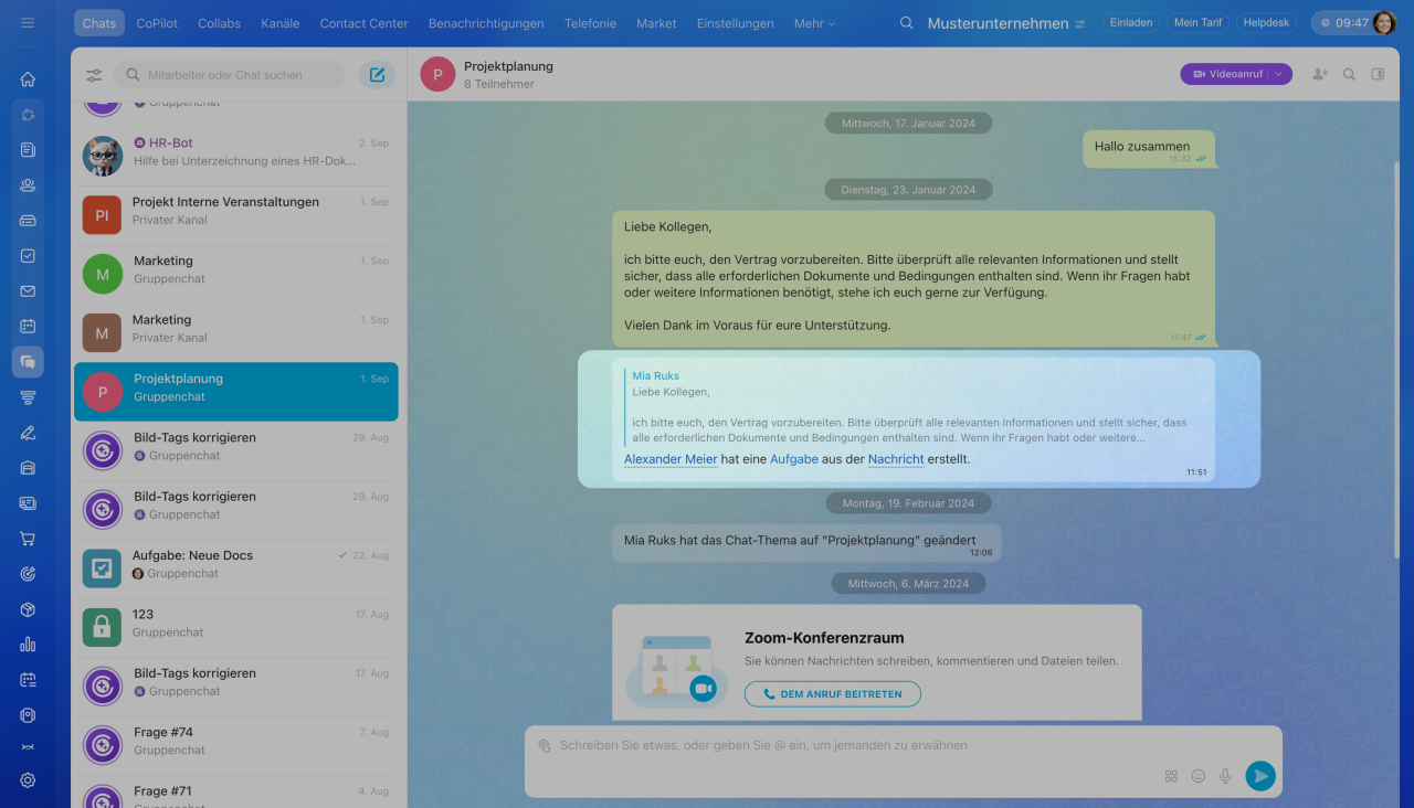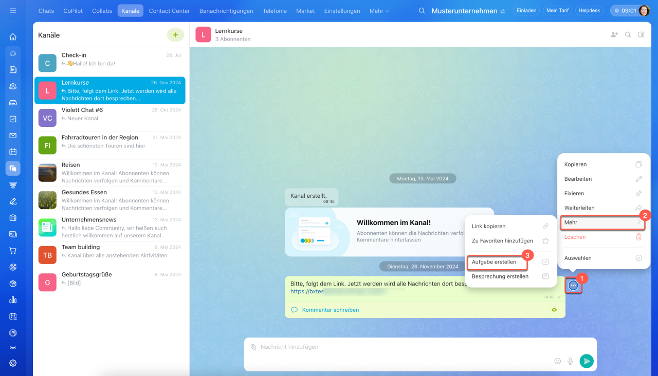 Mitarbeiter besprechen häufig Arbeitsfragen und Pläne in Chats und Kanälen. Um Vereinbarungen schnell festzuhalten und wichtige Aufgaben nicht zu verlieren, erstellen Sie eine Aufgabe oder einen Termin direkt aus einer Nachricht, einem Beitrag oder einem Kommentar.