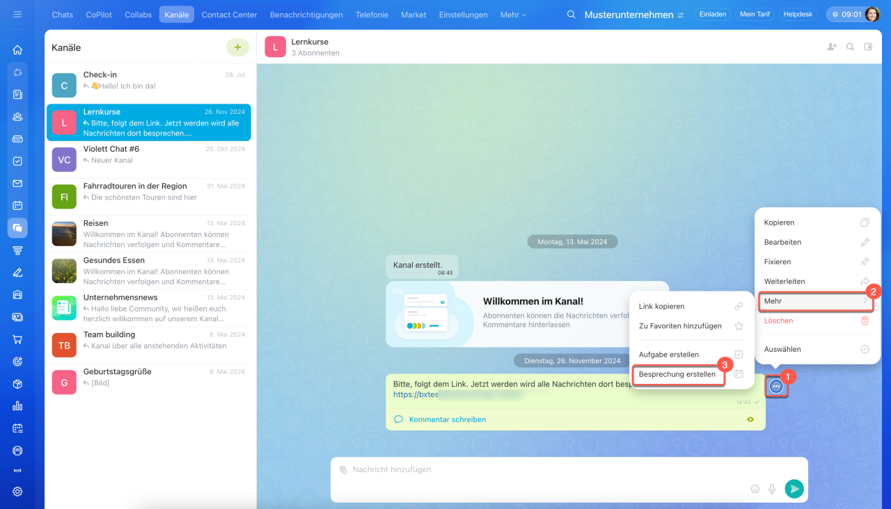 Wählen Sie eine Nachricht, einen Beitrag oder Kommentar aus, klicken Sie auf Drei Punkte (...) > Mehr > Besprechung erstellen. Daraufhin öffnet sich die Seitenleiste. Schreiben Sie den Terminnamen, geben Sie die Zeit an, wählen Sie den Kalender aus — persönlichen oder Unternehmenskalender. Für jeden Teilnehmer wird die Terminzeit in seiner Zeitzone angezeigt.