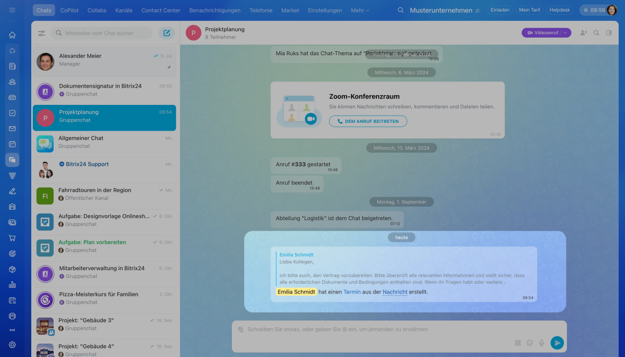 In den Chat wird eine Systemnachricht gesendet, z. B. "{Name} hat einen Termin aus der Nachricht erstellt". Blaue Wörter sind anklickbar. Klicken Sie darauf, um den Chat zu öffnen oder zur Nachricht zu wechseln, aus der der Termin erstellt wurde.