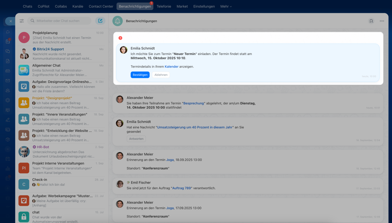 Alle Chat-Teilnehmer erhalten eine Benachrichtigung über den Termin im Benachrichtigungszentrum. Sie können ihre Teilnahme bestätigen oder ablehnen. Wenn Sie beim Erstellen des Termins die Option "Benachrichtigen, wenn Teilnehmer die Einladung bestätigen oder ablehnen" aktiviert haben, werden Sie über deren Entscheidung im Benachrichtigungszentrum informiert.