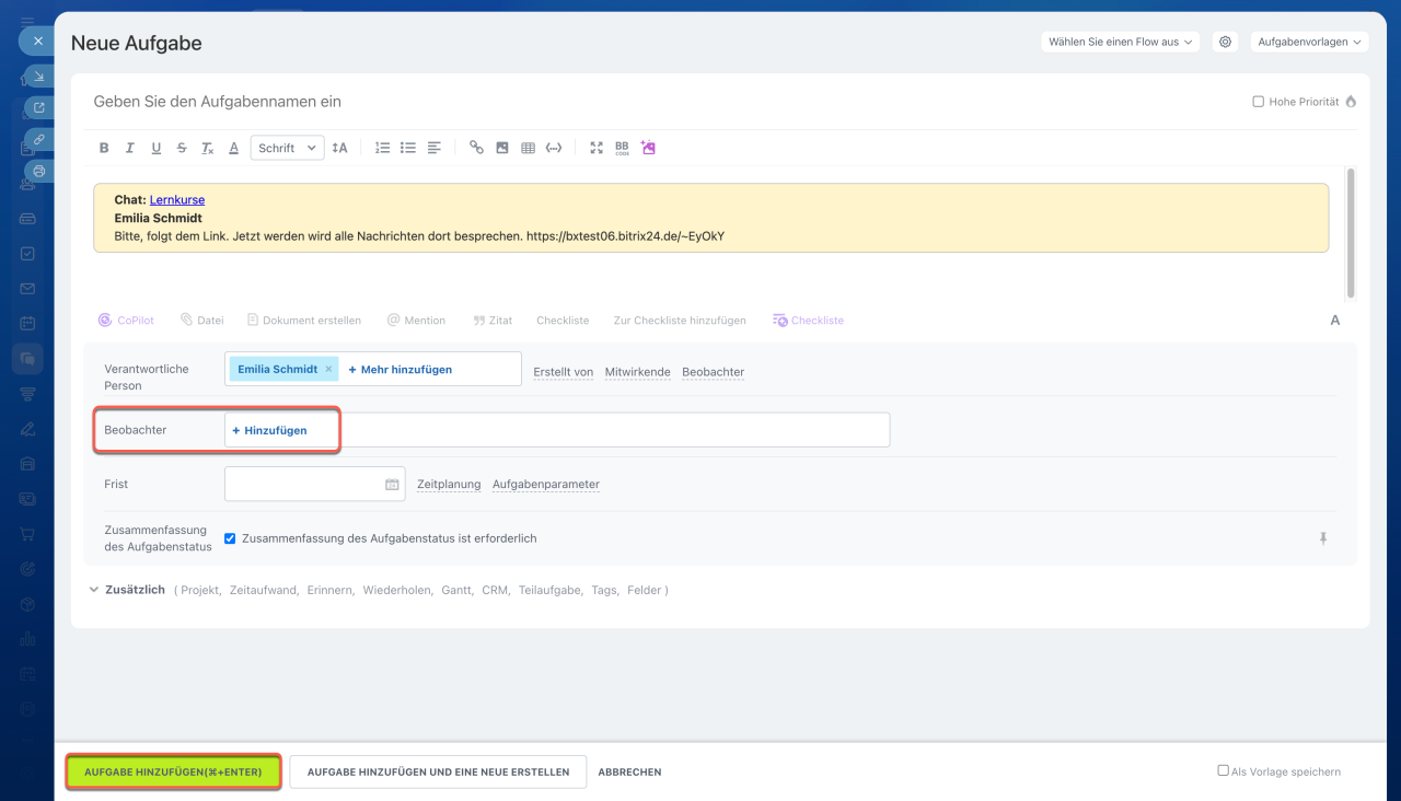 Wenn Sie eine Aufgabe aus der Nachricht im persönlichen Chat erstellen, werden Sie zum Ersteller und Verantwortlichen, während Ihr Gesprächspartner zum Beobachter wird. Im Gruppenchat werden alle Chat-Teilnehmer zu Beobachtern. Im privaten Chat wird Ihr Gesprächspartner zum Beobachter. Im Gruppenchat werden alle Chat-Teilnehmer zu Beobachtern. Im Kanal sollten Sie manuelle Beobachter hinzufügen.