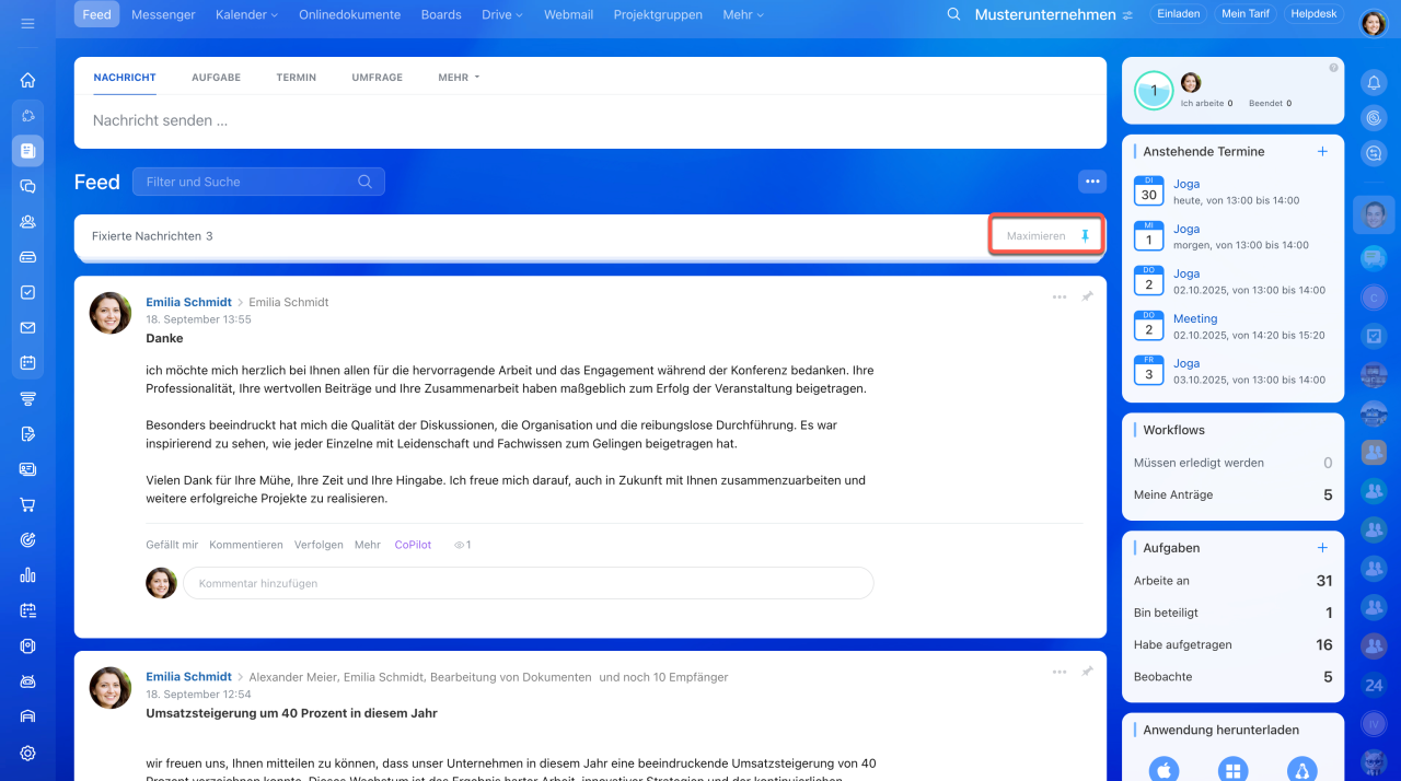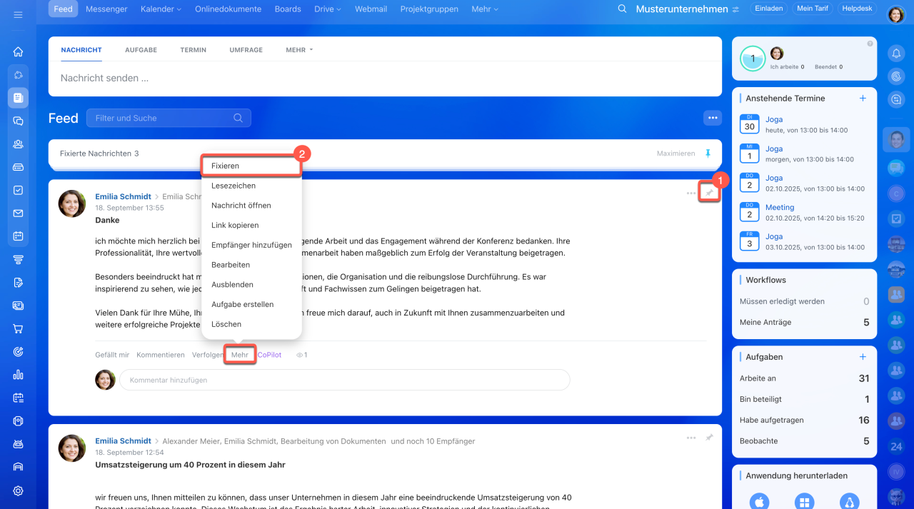 - Um einen Beitrag zu fixieren, klicken Sie auf das Stecknadel-Icon oder wählen Sie Option Fixieren unter Mehr oder Drei Punkten (...) aus. Fixierte Nachrichten können minimiert und maximiert werden.