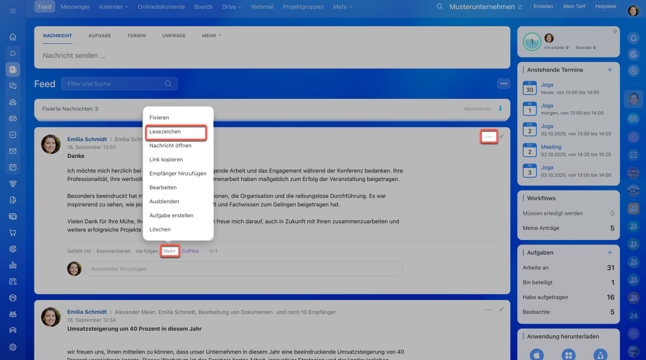 - Um den Beitrag zu Lesezeichen hinzuzufügen, wählen Sie die Option Lesezeichen unter Mehr oder unter Drei Punkten (...)aus. Danach können Sie solche Nachrichten schnell mit dem Filter finden.