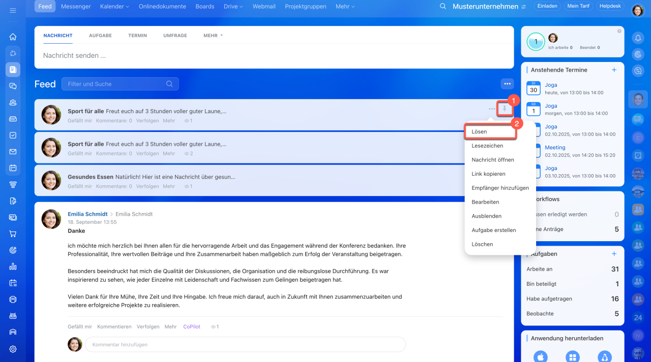 - Um einen fixierten Beitrag zu lösen, klicken Sie erneut auf das Stecknadel-Icon oder wählen Sie die Option Lösen unter Drei Punkten (...).