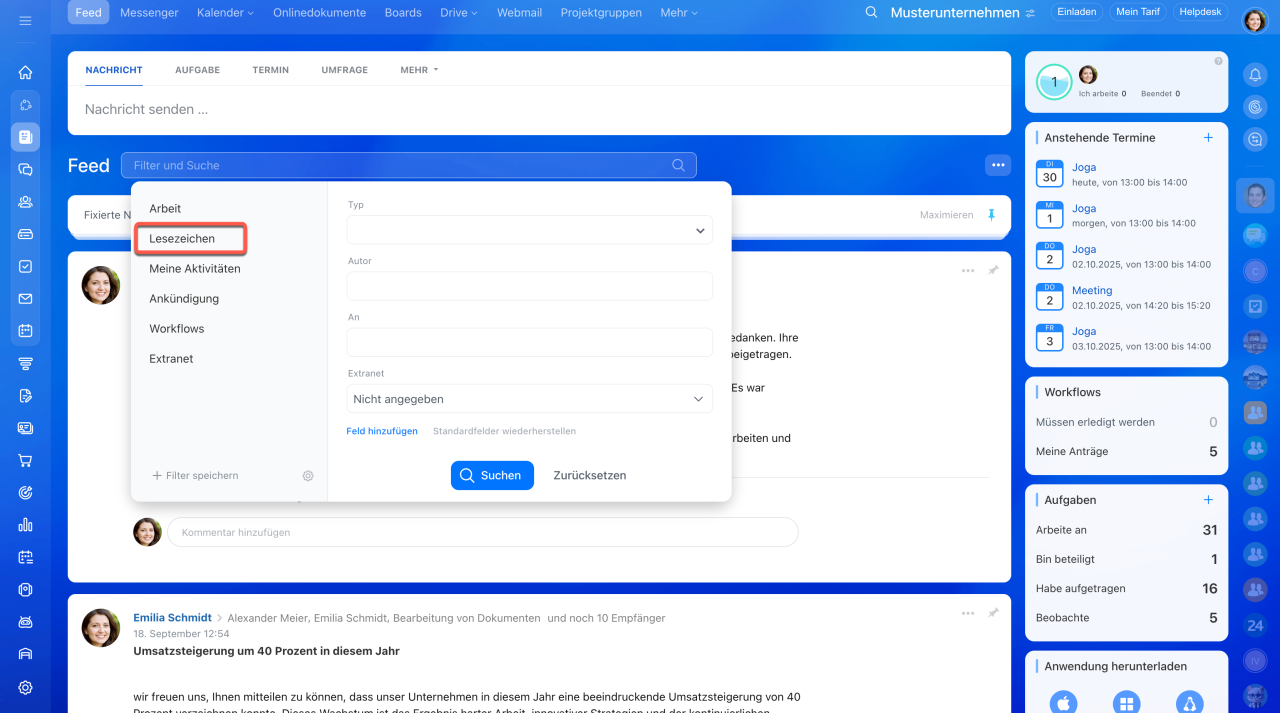 - Wichtige Beiträge im Feed können Sie fixieren oder zu Lesezeichen hinzufügen, damit Sie jederzeit diese Nachrichten schnell finden und lesen können.
