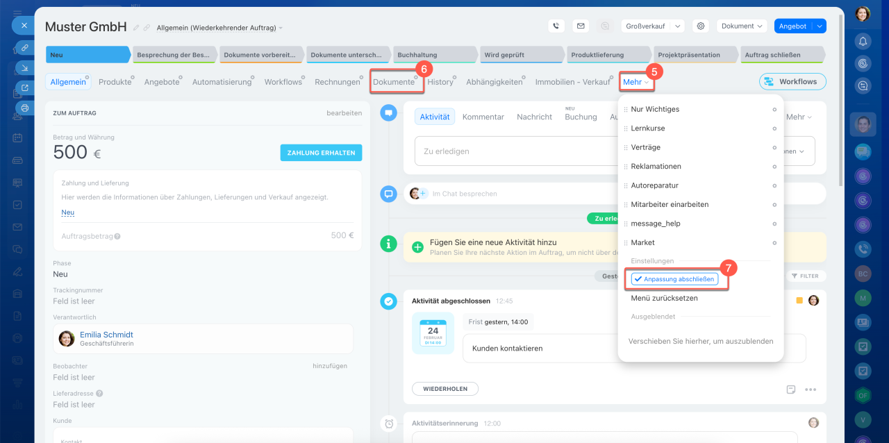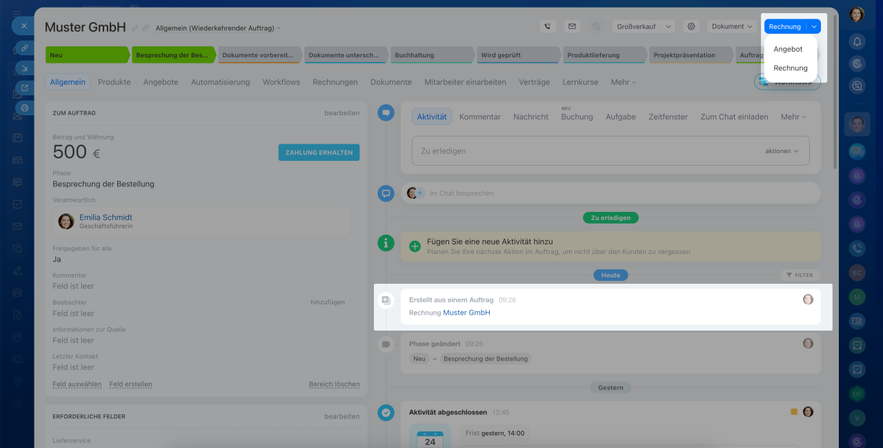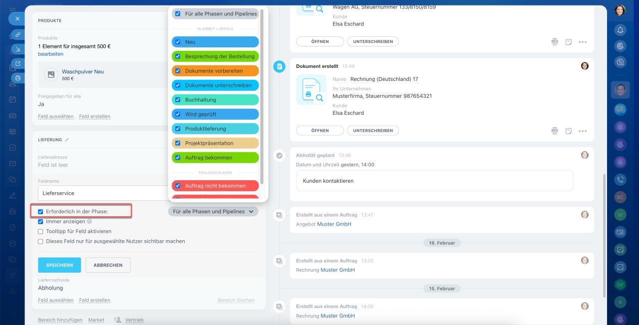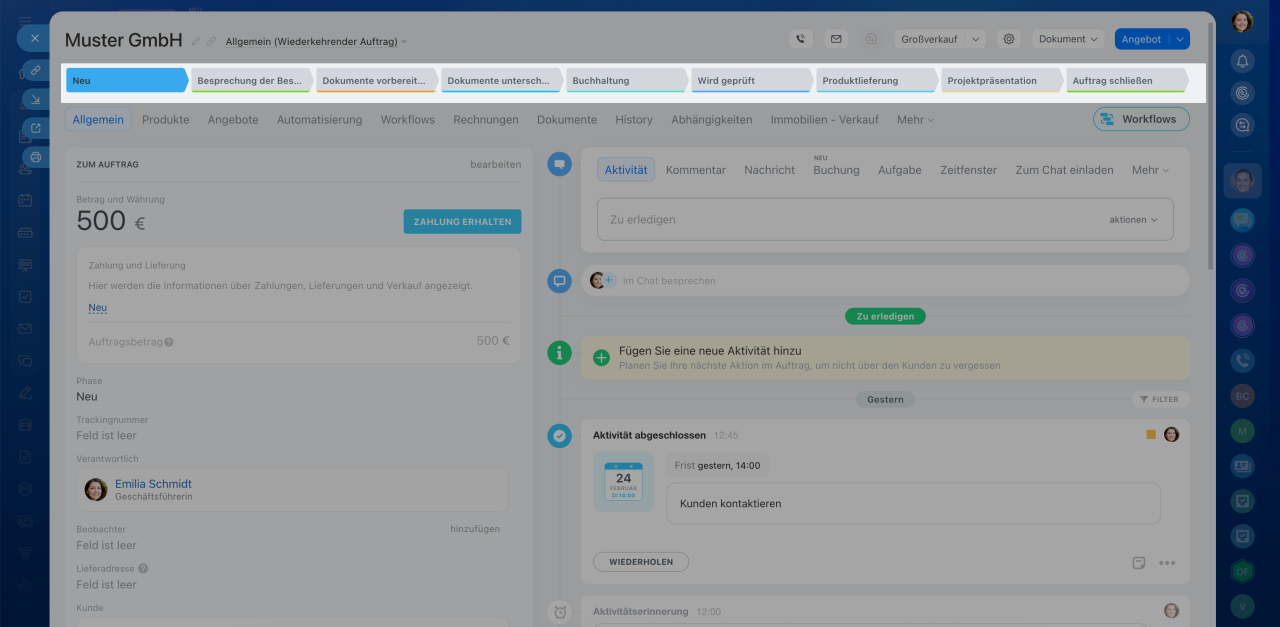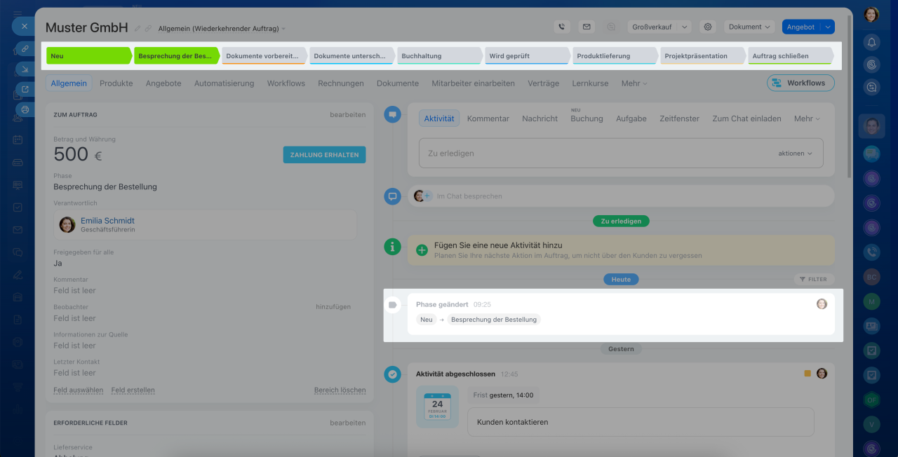 Um die Phase zu wechseln, klicken Sie auf deren Namen oben im Formular. Die Information darüber wird in der Timeline protokolliert.