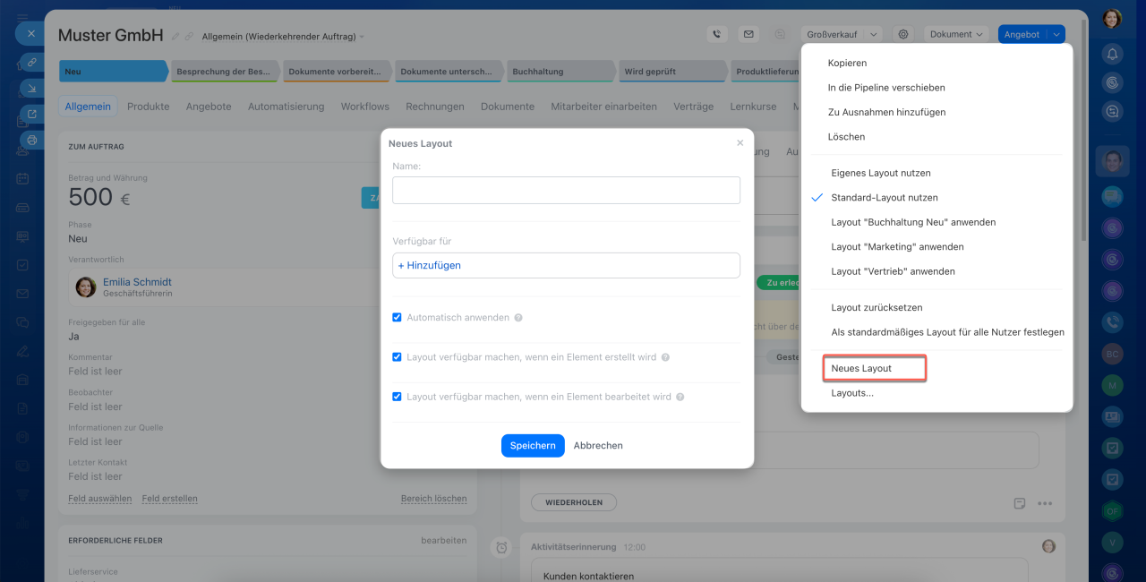 Um ein Layout zu erstellen, konfigurieren Sie das Formular und klicken Sie oben rechts auf Einstellungen (⚙️) > Neues Layout. Geben Sie einen Namen ein und wählen Sie die Nutzer oder Abteilungen aus, die mit diesem Layout arbeiten sollen.