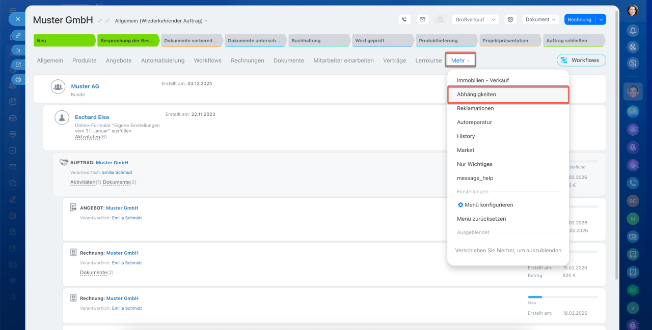 Öffnen Sie das Formular des CRM-Elements, klicken Sie auf den blauen Button in der echten Ecke oben und wählen Sie das Element aus. Die Information zum erstellten Element wird in der Timeline und im Tab Abhängigkeiten protokolliert.