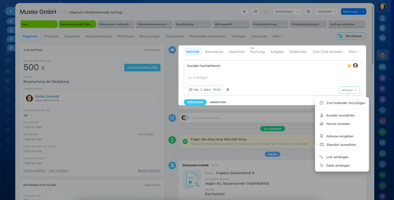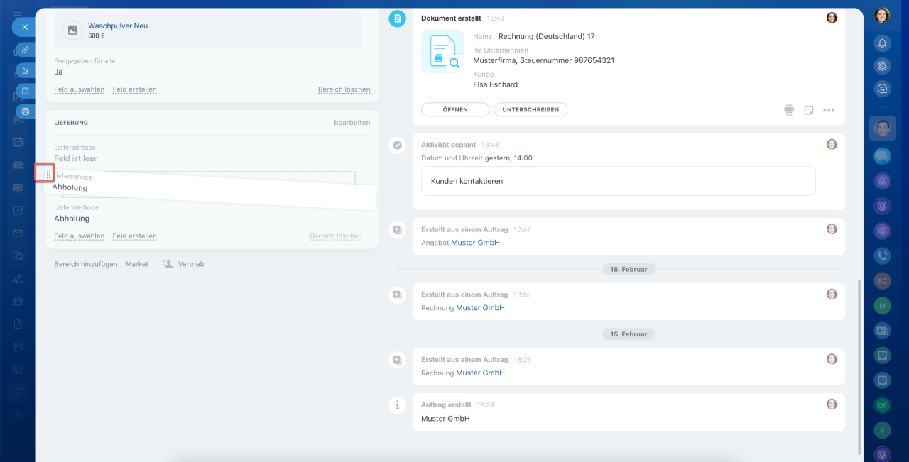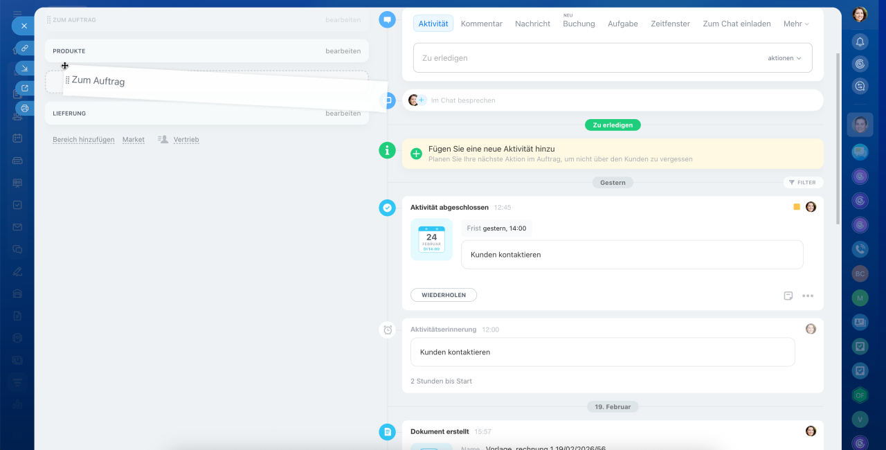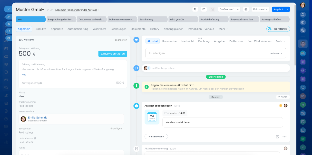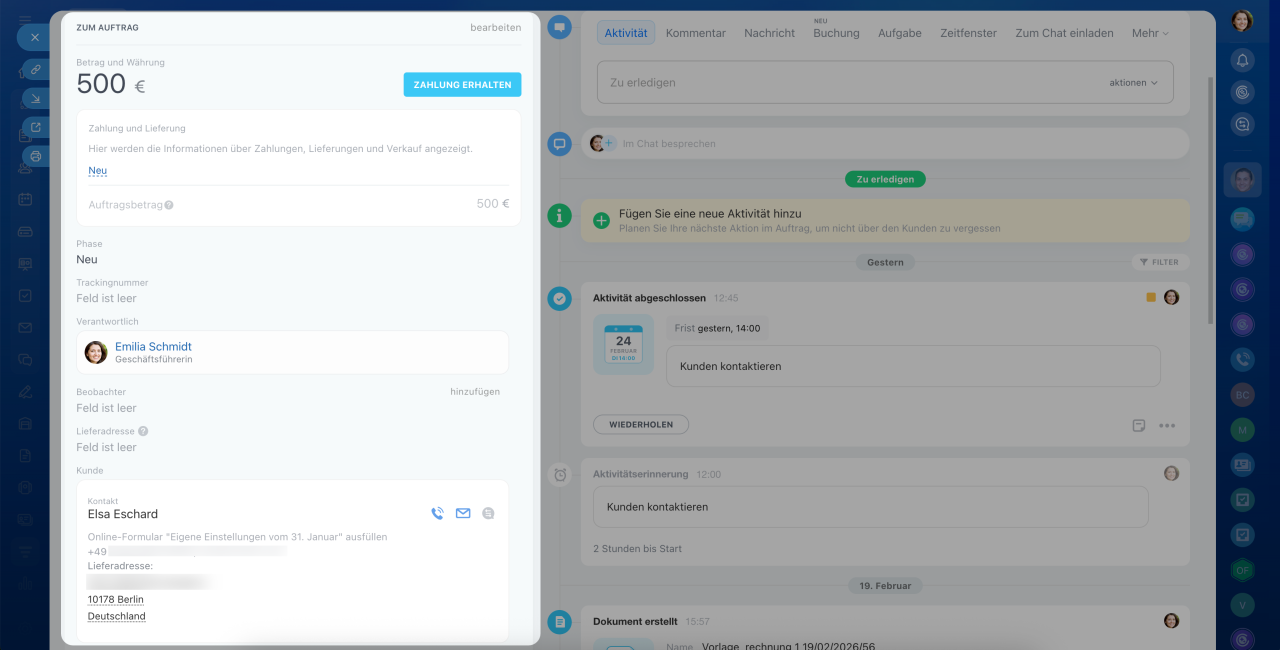 Jedes CRM-Element verfügt über ein eigenes Formular, das aus Feldern auf der linken Seite und einer Timeline auf der rechten Seite besteht. In den Feldern können Sie Kundendaten wie Namen, Kontakte und Adressen speichern. Die Timeline hält den Kommunikationsverlauf, erstellte Dokumente, Mitarbeiterkommentare und Einträge zu Phasenänderungen fest.