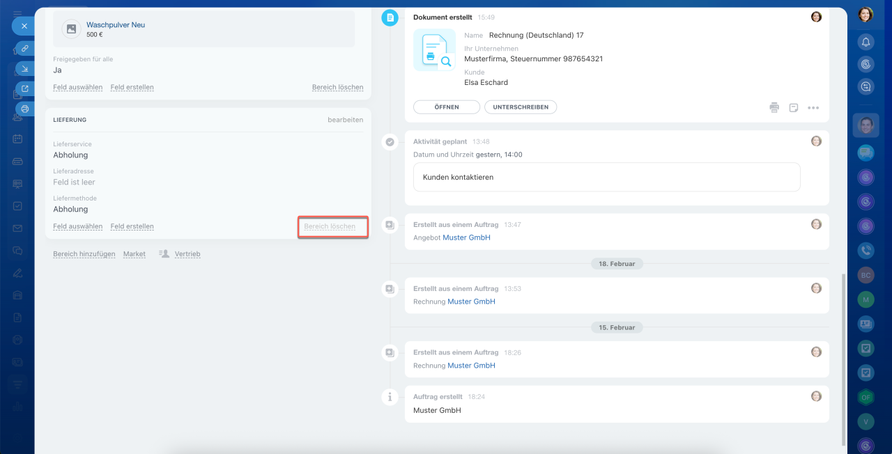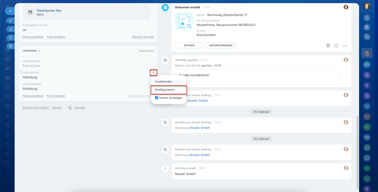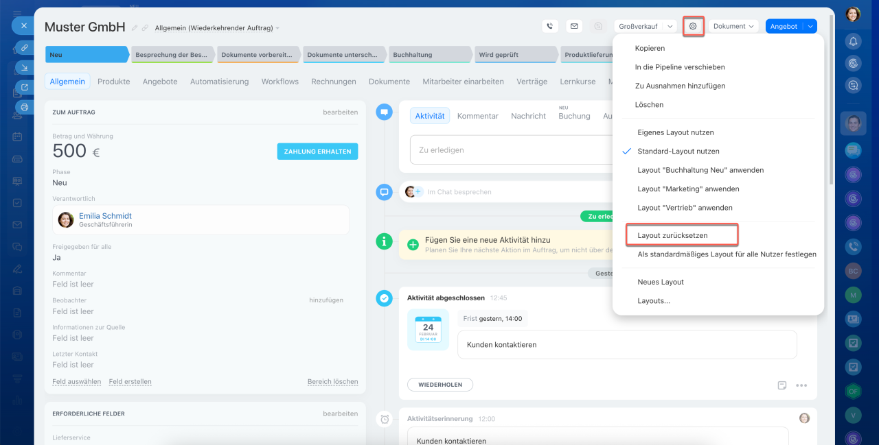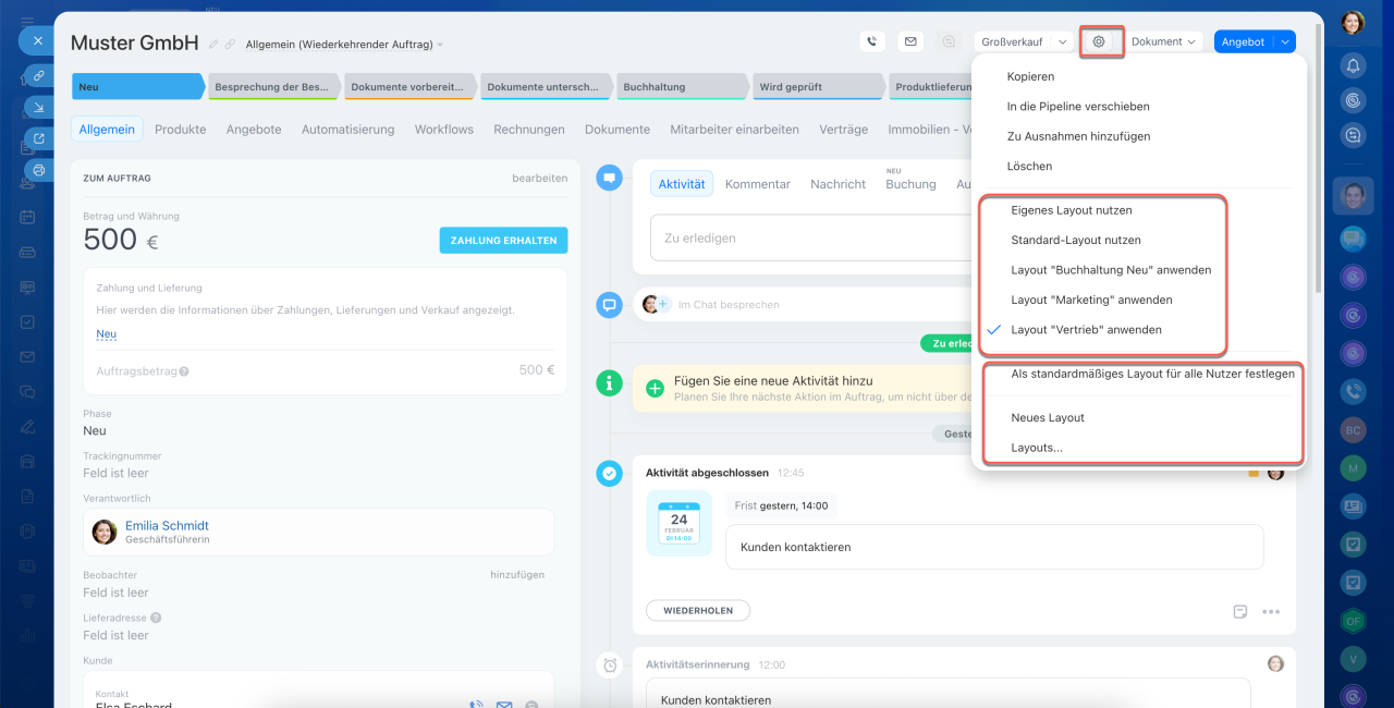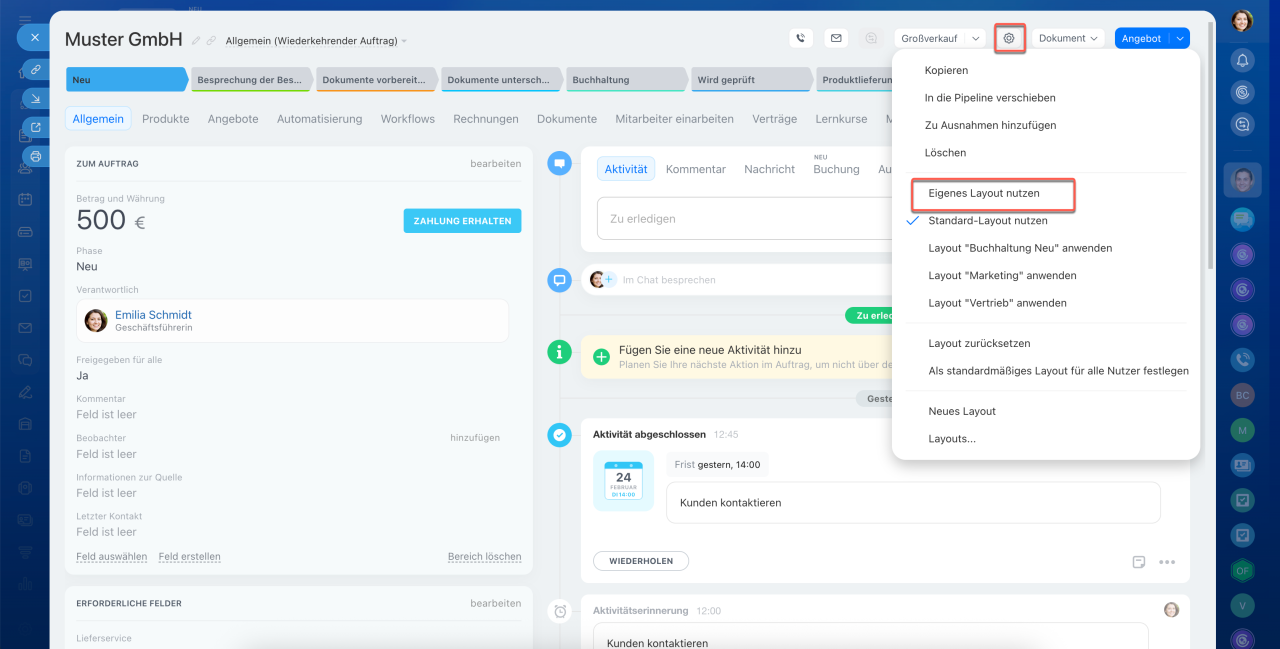 Jedes CRM-Element verfügt über ein eigenes Formular, das aus Feldern auf der linken Seite und einer Timeline auf der rechten Seite besteht. In den Feldern können Sie Kundendaten wie Namen, Kontakte und Adressen speichern. Die Timeline hält den Kommunikationsverlauf, erstellte Dokumente, Mitarbeiterkommentare und Einträge zu Phasenänderungen fest.