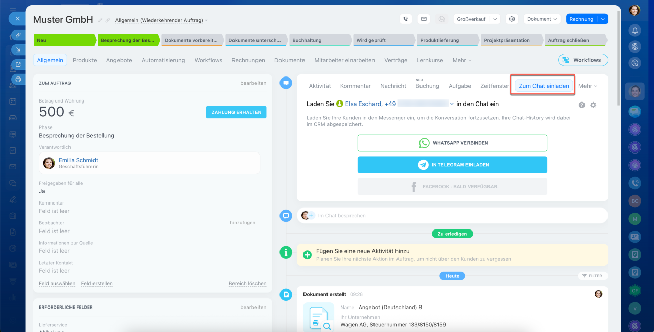 Direkt aus dem Formular des CRM-Elements können Sie den Kunden anrufen, eine E-Mail oder SMS senden und ihn in den Messenger einladen. Der gesamte Kommunikationsverlauf wird in der Timeline gespeichert.