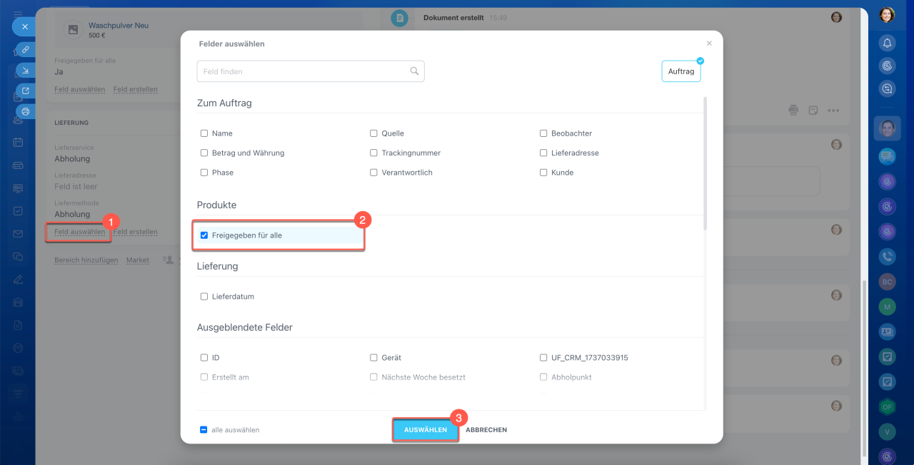 Auswählen. Nicht alle Systemfelder werden sofort im Formular des CRM-Elements angezeigt; einige können ausgeblendet sein.