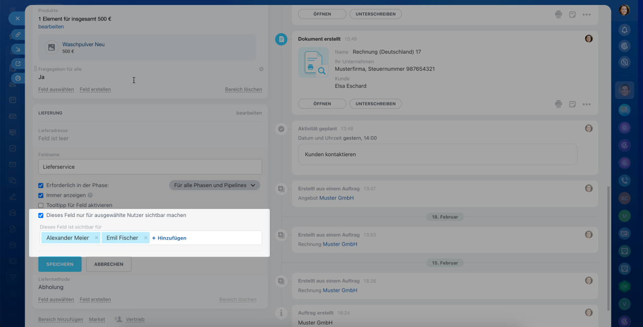 - Aktivieren Sie die Option Dieses Feld nur für ausgewählte Nutzer sichtbar machen und wählen Sie die Mitarbeiter, die das Feld sehen dürfen.