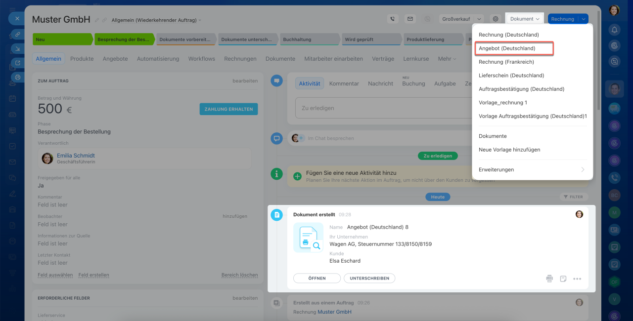 Öffnen Sie das Element, für das Sie ein Dokument erstellen möchten. Klicken Sie auf den Button Dokument und wählen Sie eine Vorlage aus. Die Daten aus dem Formular des jeweiligen CRM-Elements werden in das Dokument eingefügt. Im Angebot werden die Kundendaten sowie detaillierte Informationen zu Ihrem Unternehmen übernommen. Die Informationen zum erstellten Dokument werden in der Timeline protokolliert.