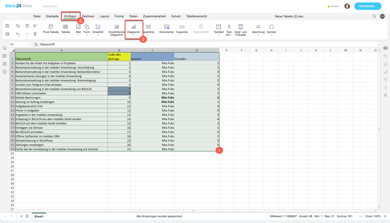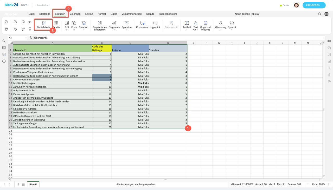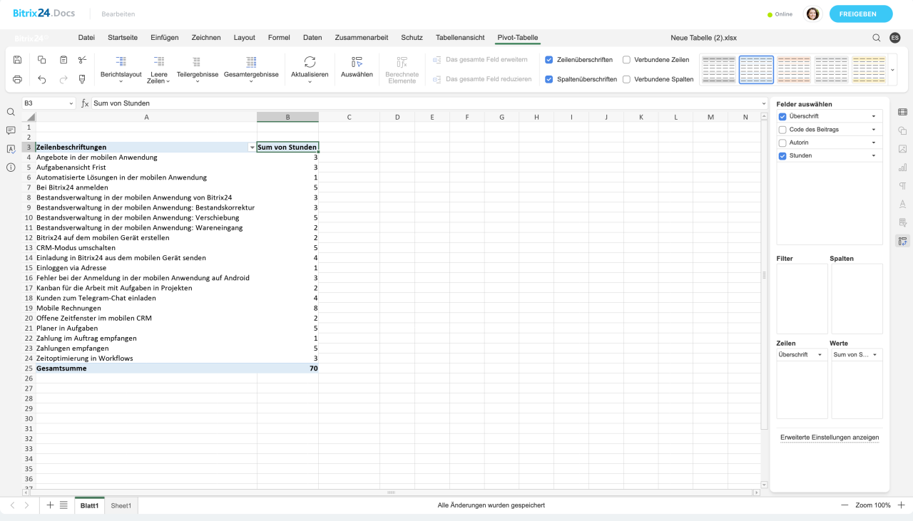 - Bitrix24.Docs bietet zahlreiche Funktionen: Passen Sie das Interface an, erstellen Sie Diagramme, fügen Sie Pivot-Tabellen hinzu und vieles mehr.