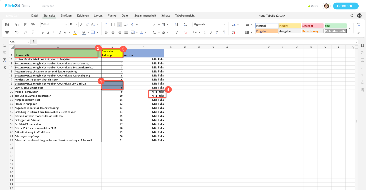 Um die Tabelle benutzerfreundlicher zu gestalten, formatieren Sie die Zellen. Beispielsweise können Sie Zellen, die besondere Aufmerksamkeit erfordern, farblich hervorheben (1) oder die Breite der Spalten anpassen (2).