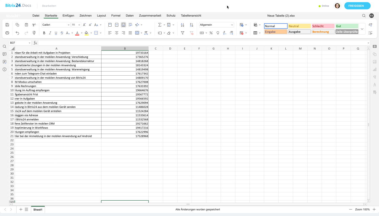 - In Bitrix24 können Sie Tabellen direkt im integrierten Editor Bitrix24.Docs bearbeiten.