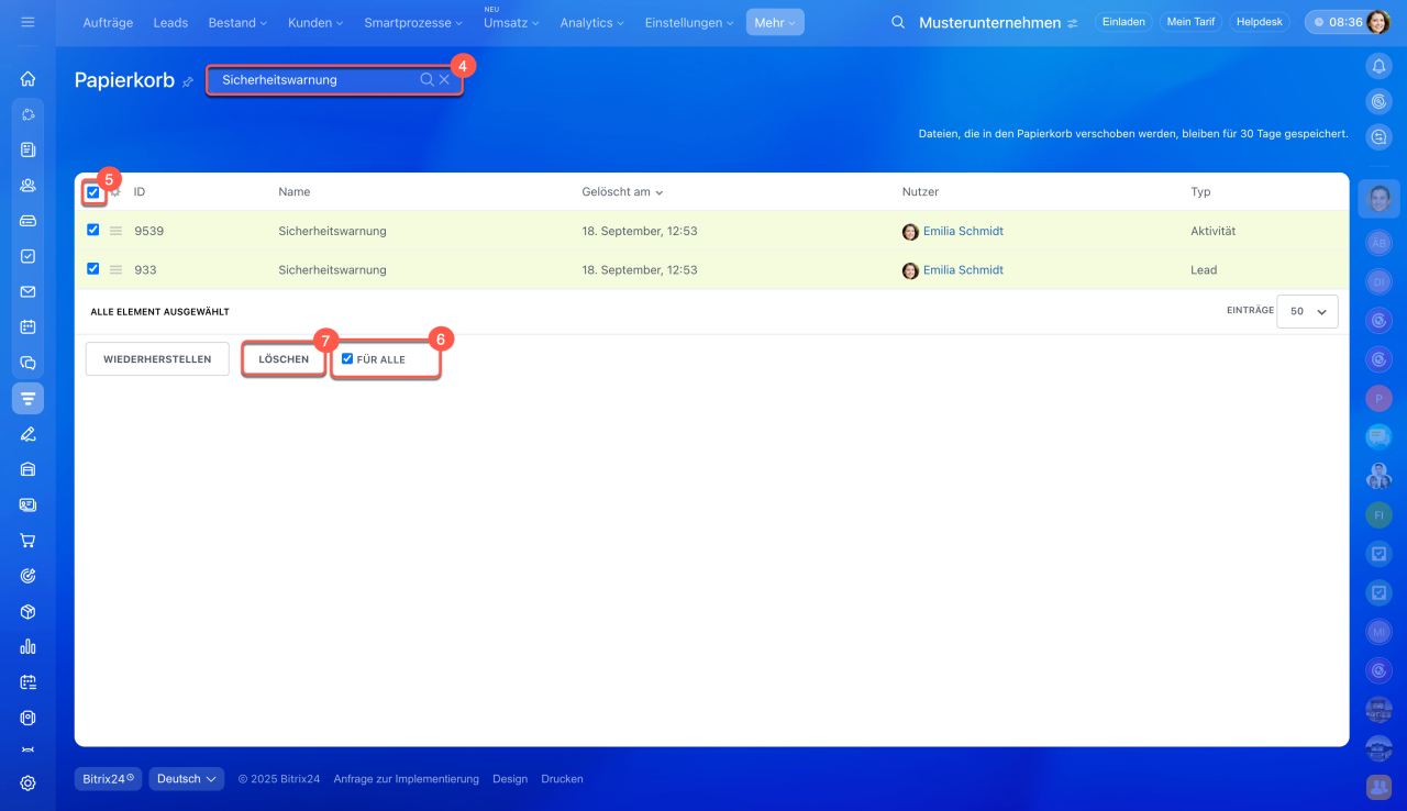 Alle gelöschten Elemente werden zunächst in den Papierkorb verschoben, wo sie 30 Tage gespeichert bleiben, bevor sie endgültig gelöscht werden. In dieser Zeit können Sie die Elemente entweder wiederherstellen oder dauerhaft entfernen.
