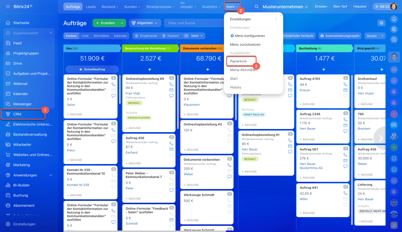 1-3. Öffnen Sie den Bereich CRM > Mehr > Papierkorb.