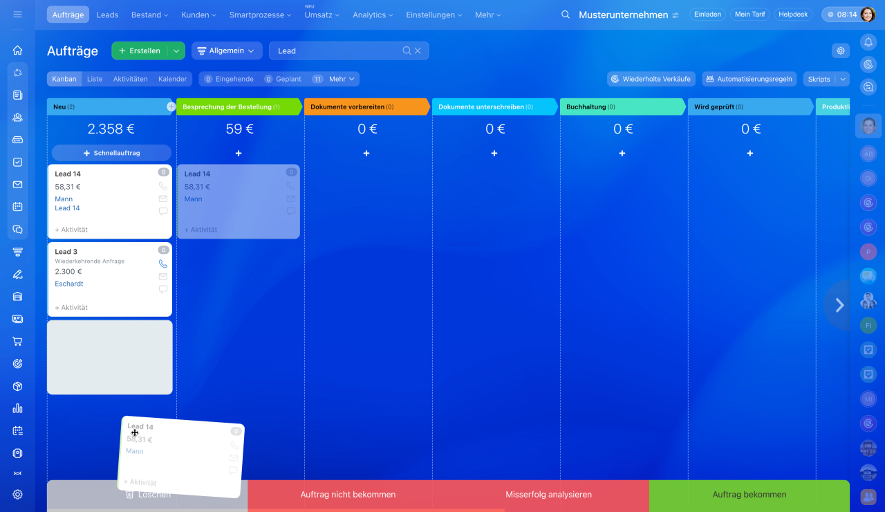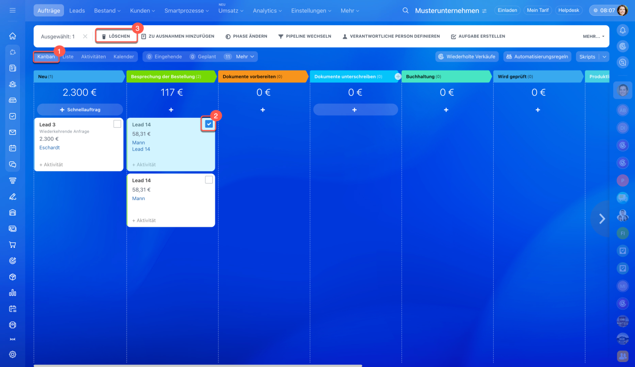 CRM-Elemente im Kanban löschen