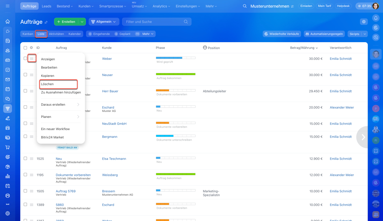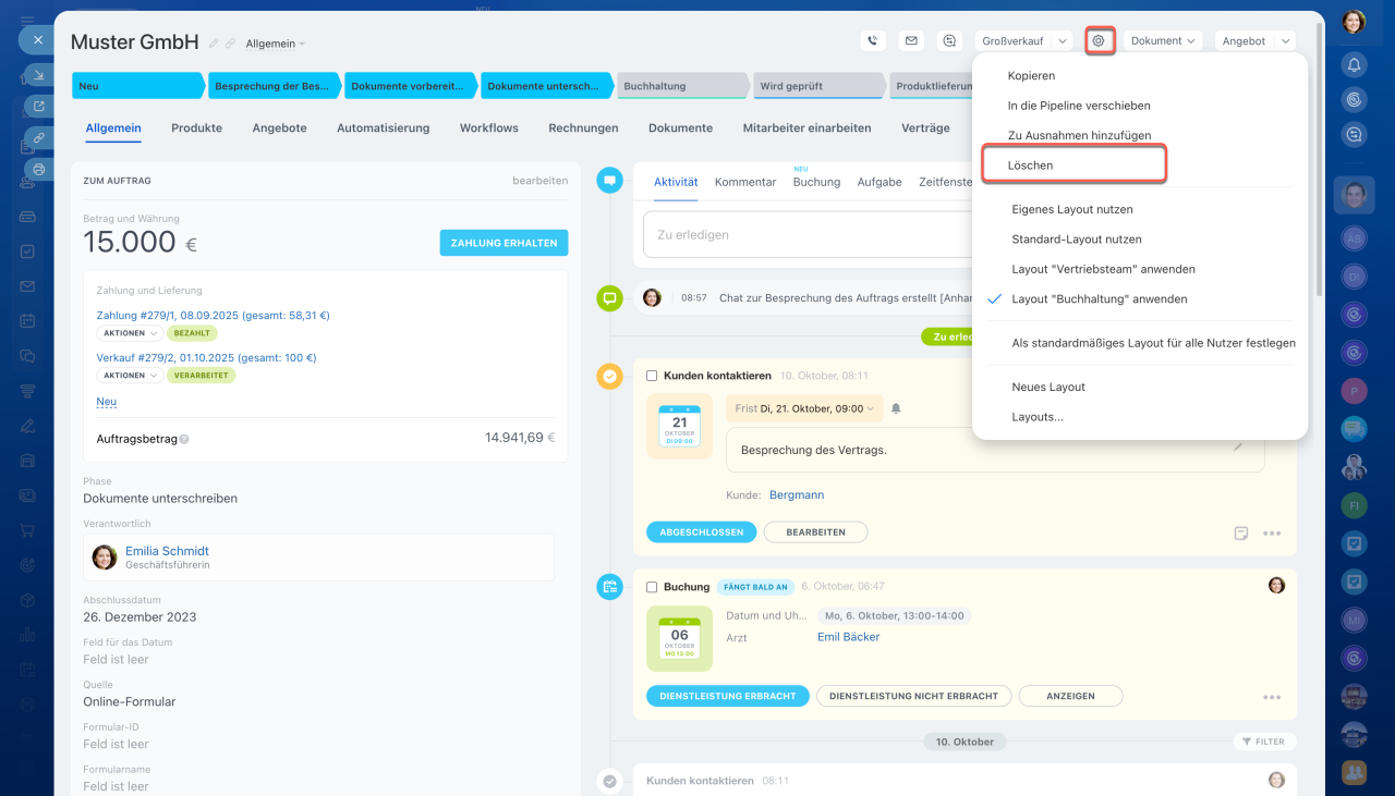 - CRM-Elemente können aus der Liste, aus dem Kanban und Formular des CRM-Elements gelöscht werden.