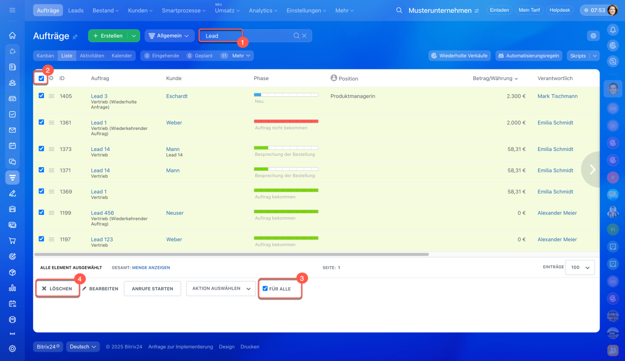 CRM-Elemente in der Liste löschen