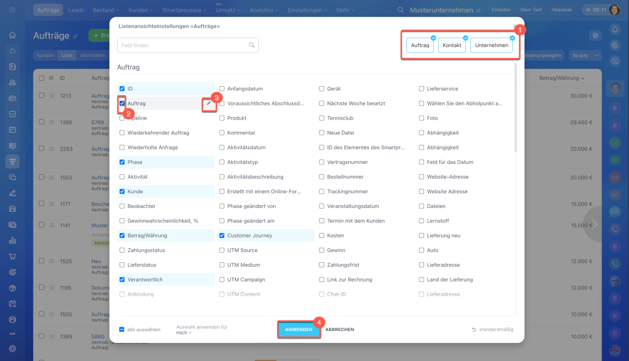 - Bestimmen Sie die Felder, die in der Liste sichtbar sein sollen.