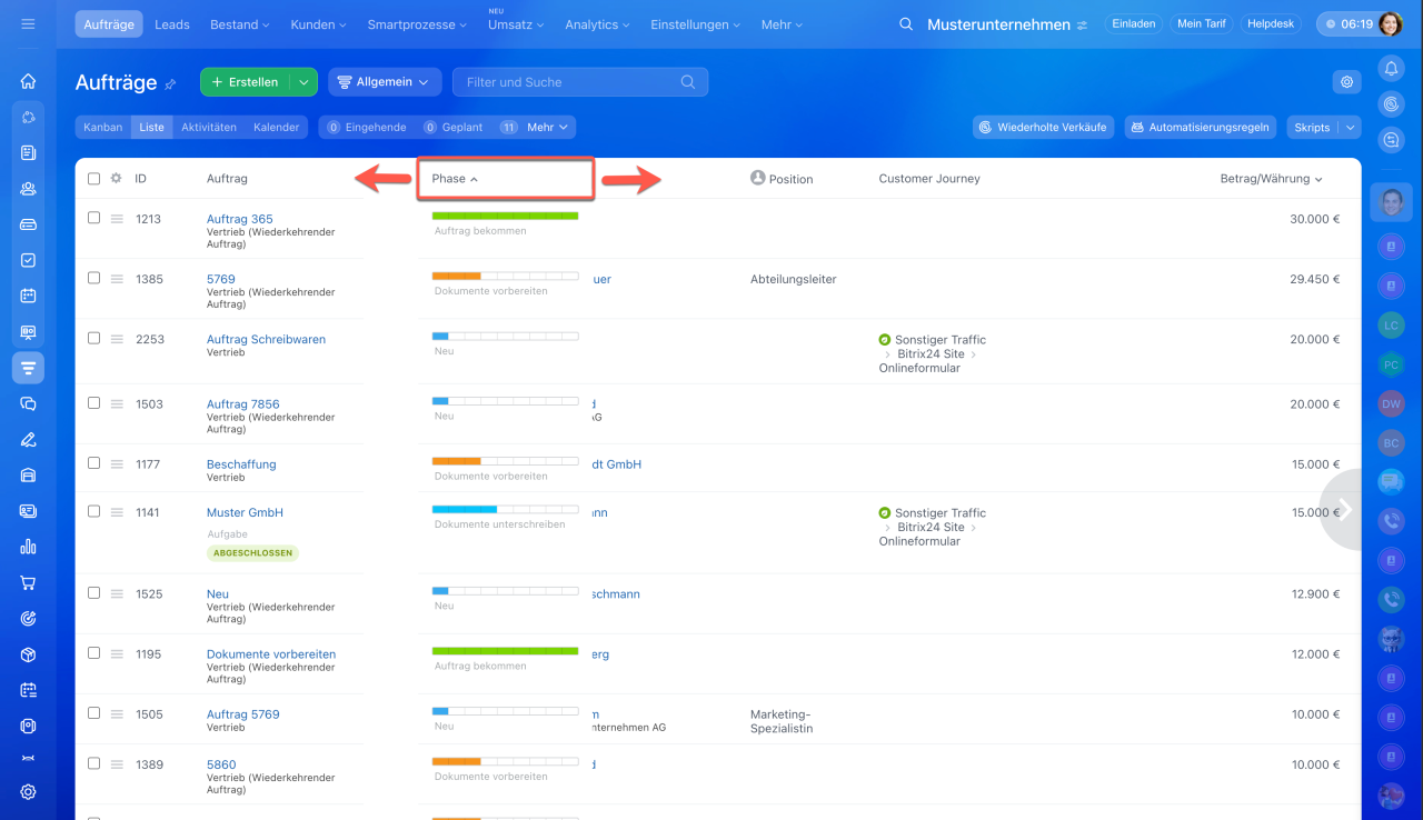 Eine Tabelle ist ideal für die Arbeit mit großen Datenmengen. In Bitrix24 können alle CRM-Elemente als Liste dargestellt werden.