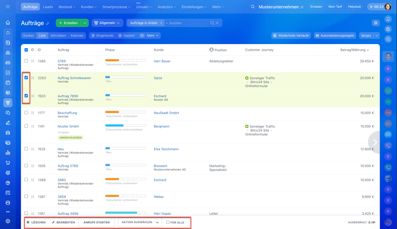 Gruppenoptionen. Alle Listen in Bitrix24 verfügen über die Gruppenoptionen. Wählen Sie aus der Liste die benötigten Elemente aus oder kreuzen Sie mit der entsprechenden Option gleichzeitig alle Einträge an und tippen Sie auf eine der verfügbaren Aktionen.