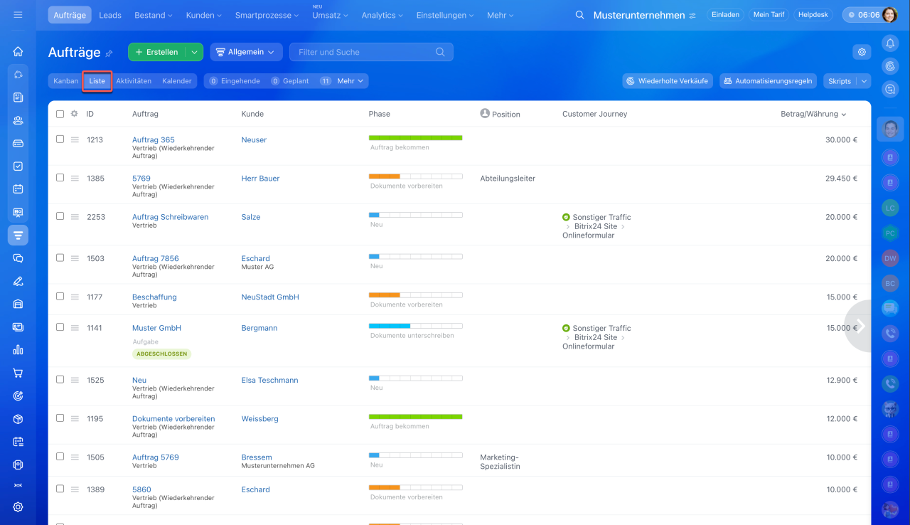 - In Bitrix24 können alle CRM-Elemente als Liste dargestellt werden.